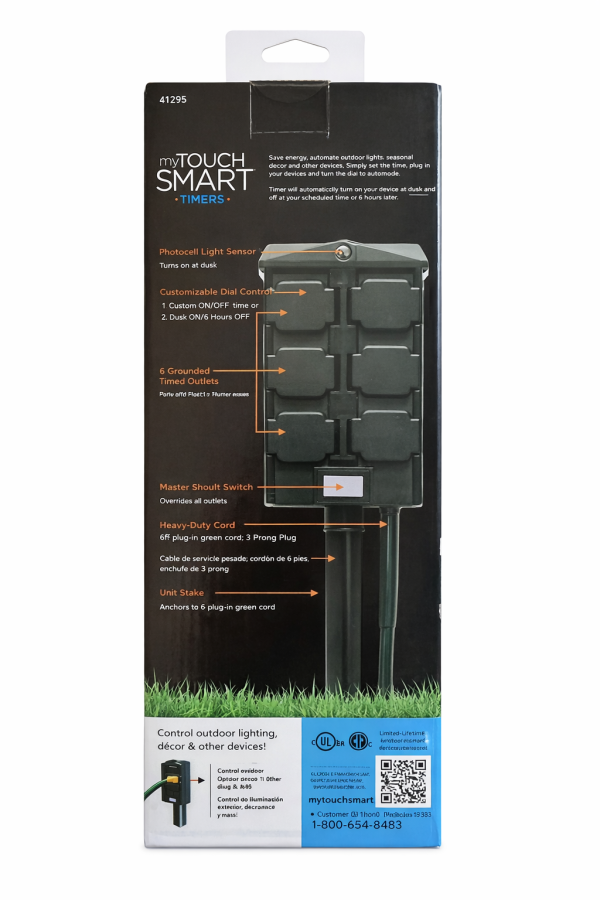 Temporizador para exteriores que no necesita ser programado. El sensor incorporado se encenderá automaticamente al anochecer y se apagará seis horas mas tarde.